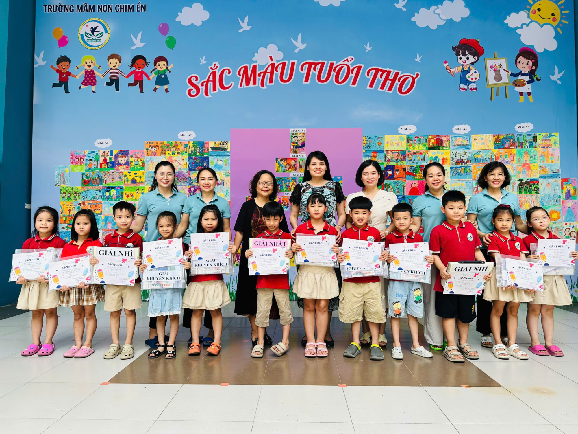Cuộc thi kết thúc trong tiếng cười giòn giã và ánh mắt háo hức của các bé khi được nhìn ngắm "triển lãm mini" trưng bày các bức tranh dự thi ngay tại sân trường. Đây chính là một hoạt động ý nghĩa góp phần nuôi dưỡng tâm hồn, khơi dậy tình yêu nghệ thuật và phát triển toàn diện cho trẻ ngay từ những năm tháng đầu đời.