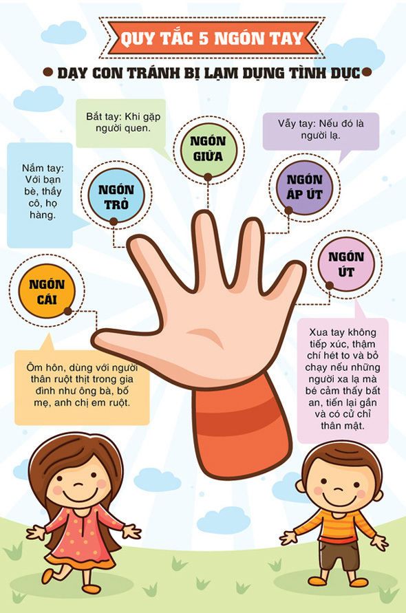 - Để giú !important;p trẻ tránh bị xâm hại tình dục, một trong những quy tắc bố mẹ có thể dạy con là "quy tắc 5 ngón tay". Quy tắc này cực đơn giản, sẽ giúp trẻ có thể tránh xa những đối tượng nguy hiểm và bảo vệ chính bản thân mình.