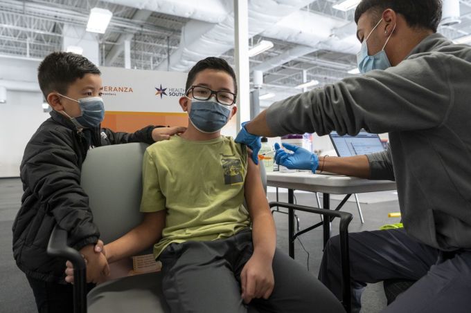 Bé Dante Garcia, 9 tuổi, được tiêm liều vaccine Pfizer/BioNTech đầu tiên vào ngày 04/11/2021 tại Trung tâm Y tế Esperanza, Philadelphia, Mỹ. Ảnh: Sun-Times