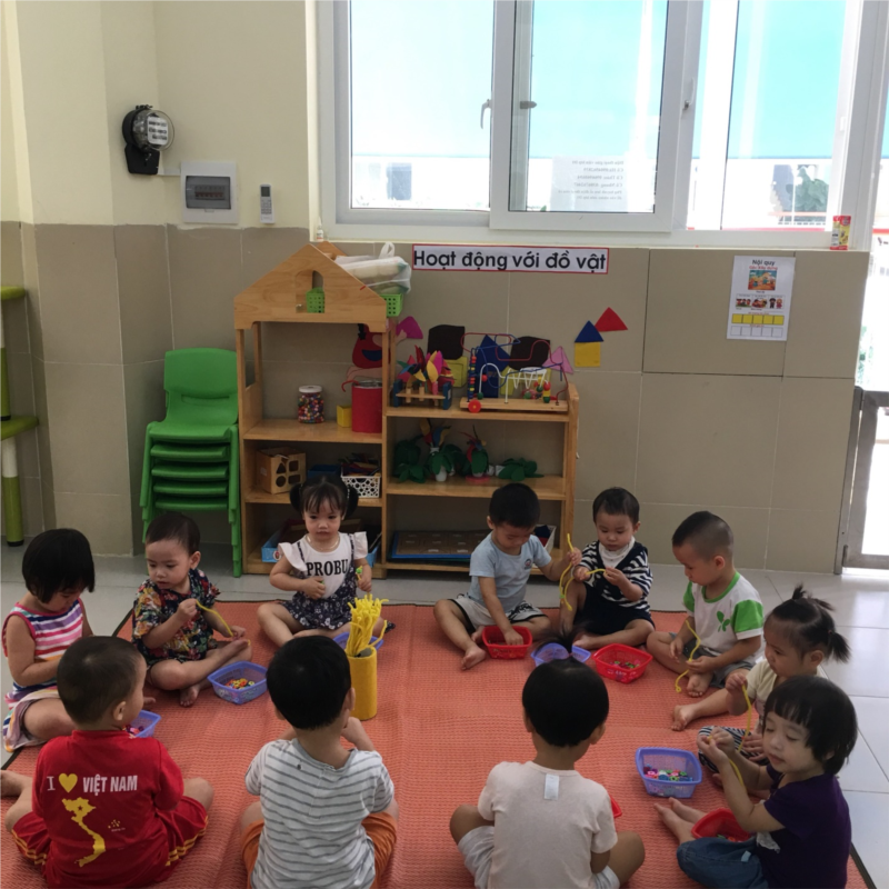 Trẻ được tham gia với nhiều góc chơi : Bế em , Âm nhạc , Xâu vòng , bình chơi với hình và màu , Vận động .Qua các góc chơi này giúp trẻ hình thành cảm xúc tình cảm và đồng thời giúp trẻ phát huy tính kiên trì , sự khóe léo của cơ ngón tay , bàn tay.Sau đây là 1 số hình ảnh lớp D1 :