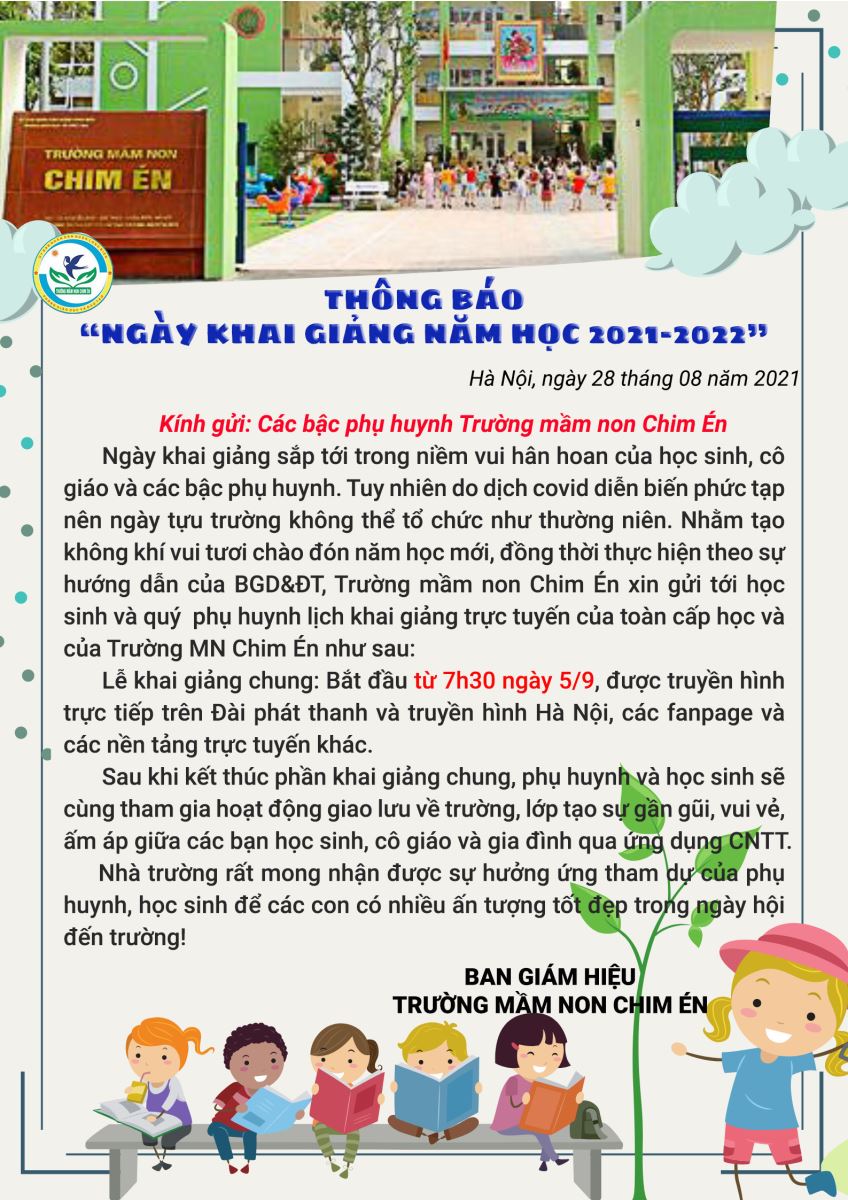 🌟Trước tình hình dịch bệnh COVID đang diễn ra phức tạp trên địa bàn thành phố Hà Nội. Thực hiện sự chỉ đạo của SGD & ĐT Hà Nội, Trường Mầm Non Chim Én trân trọng thông báo tới Quý phụ huynh, học sinh lịch khai giảng năm học 2021 - 2022. ✅ Nhà trường rất mong nhận được sự quan tâm, hưởng ứng và các ý kiến đóng góp từ Phụ huynh và Học sinh. -------------- 🌈 : Trường Mầm non Chim Én 🌈 👉 Địa chỉ: 113 Nguyễn Sơn - Gia Thuỵ - Long Biên - Hà Nội #Mầm_non_Chim_Én