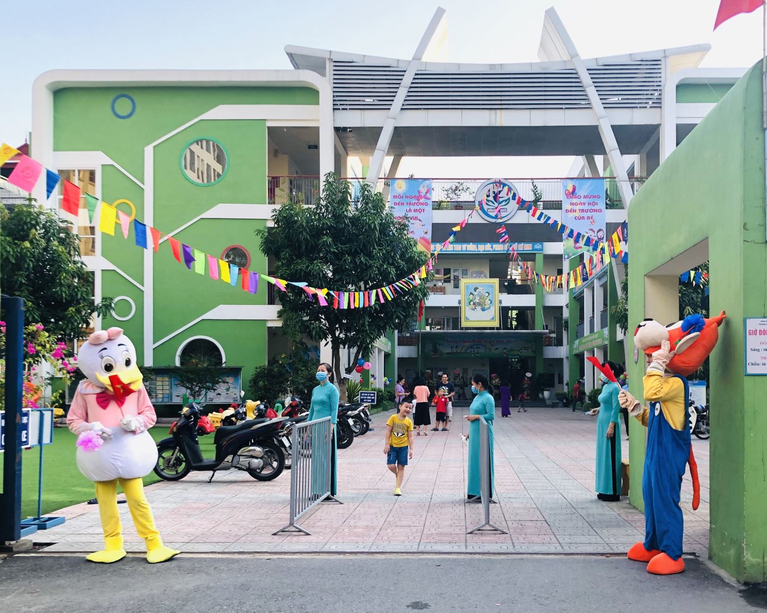 Sân trường rực rỡ cờ hoa và tiếng cười giòn tan của các bạn nhỏ trường mầm non Chim Én