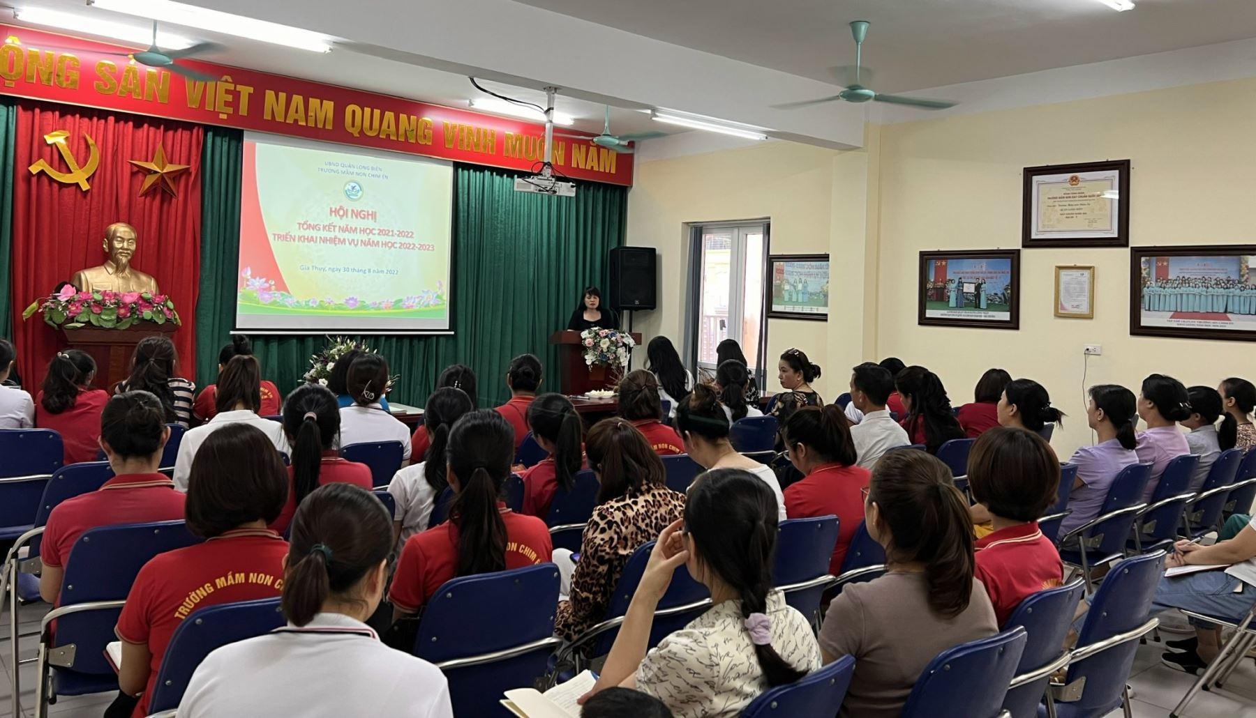 Báo cáo công tác năm học 2021 – 2022 tại Hội nghị, Đồng chí Vũ Thị Phương – Bí thư chi bộ, Hiệu trưởng nhà trường ghi nhận và đánh giá cao những giải pháp linh hoạt, khả thi, đồng bộ của tổ chuyên môn nhằm duy trì liên lạc với học sinh, phụ huynh qua các kênh online nhằm hướng dẫn phụ huynh tổ chức chăm sóc nuôi dưỡng và giáo dục tại nhà cho trẻ trong thời gian tạm nghỉ đến trường. Với tâm huyết, trách nhiệm và tài năng sư phạm của tập thể CBGV đã xuất sắc hoàn thành nhiệm vụ năm học đặc biệt đầy khó khăn, thử thách.