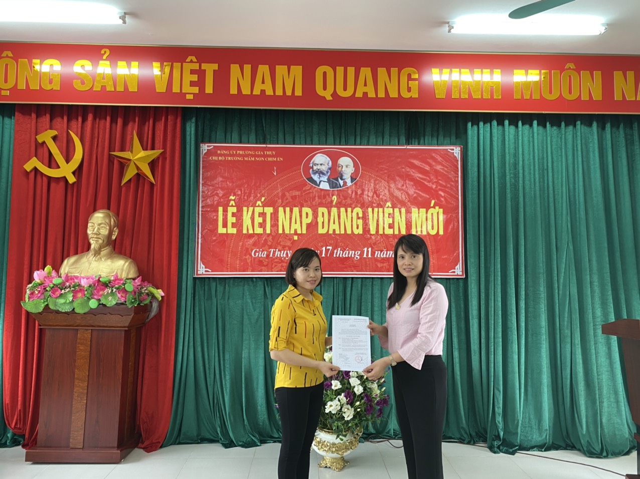 Công tác phát triển Đảng là nhiệm vụ thường xuyên có ý nghĩa quan trọng trong công tác xây dựng Đảng, góp phần xây dựng tổ chức cơ sở đảng vững mạnh. Chi bộ Trường mầm non Chim Én trực thuộc Đảng ủy Phường Gia Thụy luôn quan tâm chỉ đạo công tác phát triển Đảng, đặc biệt là phát triển Đảng trong quần chúng ưu tú trẻ tuổi. Sáng ngày 17/11/2020, Chi bộ Trường mầm non Chim Én đã tổ chức kết nạp Đảng cho 01 quần chúng ưu tú là Lương Thị Trang - giáo viên trường mầm non Chim Én.