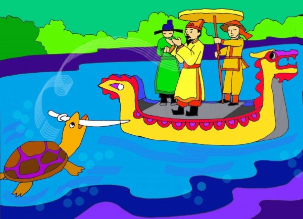Một năm sau, nhân ngày trời trong gió mát. Lê Lợi cùng các quan đi thuyền dạo chơi trên hồ Tả Vọng. Khi thuyền nhà vua vừa đến giữa hồ thì bỗng có một con rùa vàng rất to từ dưới nước nhô lên, hướng về phía thuyền nhà vua. Rùa vàng gật đầu ba cái chào vua Lê Lợi rồi nói: