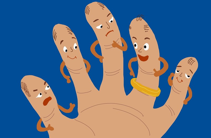 Ngón tay đeo nhẫn vênh mặt nói một cách tự hào rằng hắn đóng vai trò quan trọng nhất: chính hắn là người mang dấu hiệu tượng trưng cho sự trưởng thành của chủ, tức là đeo nhẫn cưới.