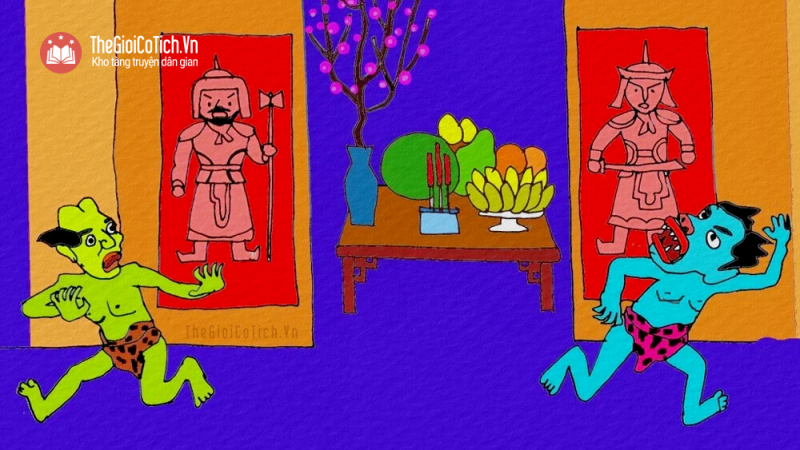 Để ma quỷ khỏi quấy phá, dân chúng đã nghĩ ra một cách là đi bẻ cành hoa đào về cắm trong lọ. Nếu ai không bẻ được cành đào thì lấy giấy hồng điều vẽ hình 2 vị thần linh dán ở cột trước nhà để xua đuổi ma quỷ.