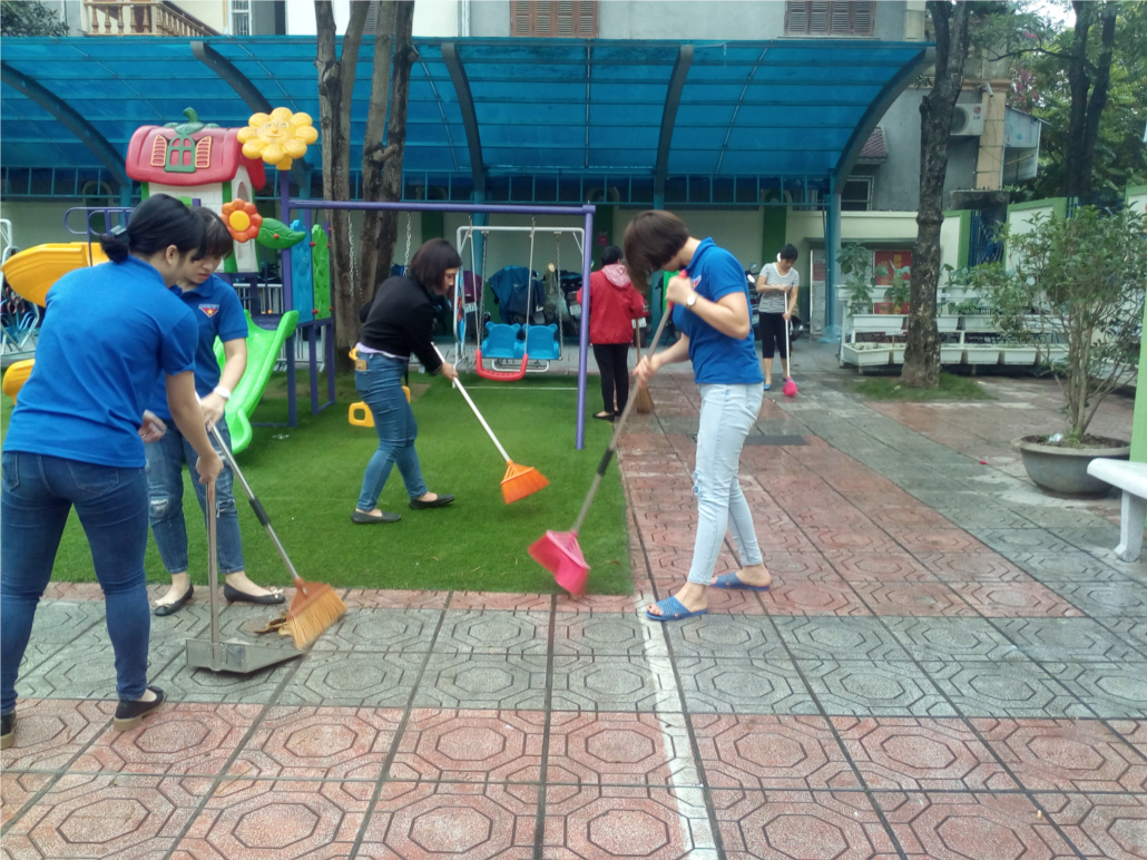 Hưởng ứng chiến dịch tổng vệ sinh môi trường , đúng 7h ngày 23 tháng 03 năm 2019, 40/49 cán bộ công nhân viên ( 03 đồng chí nghỉ đẻ, 06 đồng chí đi tập huấn) có mặt tại trường tham gia lao động, tổng vệ sinh lớp học, sân trường, đồ chơi, bếp, cống rãnh, thùng rác,téc nước phòng chống dịch bệnh.